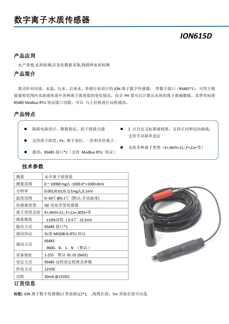 數(shù)字式氨氮/鈣/氟/氯離子水質(zhì)傳感器 ION615D
